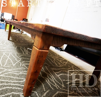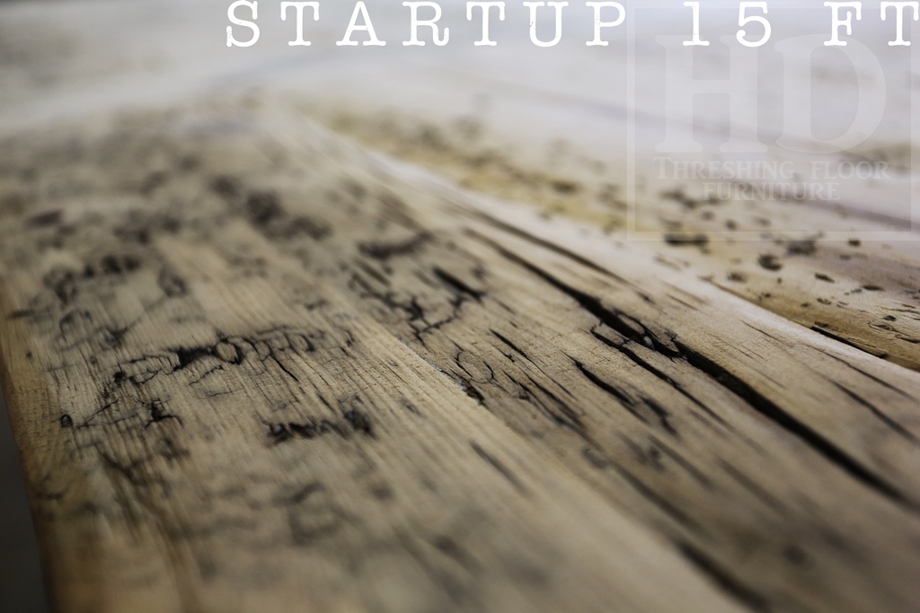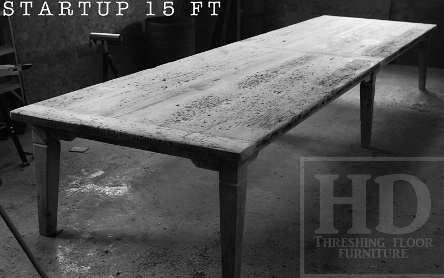 Specifications: 15 foot Boardroom Harvest Table – 50″ wide – Premium epoxy/ matte polyurethane finish – Reclaimed Hemlock Threshing Floor Ontario Barn Construction – Tapered with a Notch Windbrace Beam Legs – On-site centre final dry-doweling
