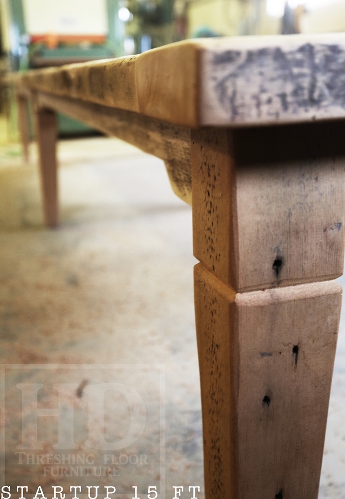 Specifications: 15 foot Harvest Table – 50″ wide – Premium epoxy/ matte polyurethane finish – Reclaimed Hemlock Threshing Floor Ontario Barn Construction – Tapered with a Notch Windbrace Beam Legs – On-site centre final dry-doweling