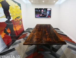Specifications: 10 ft Reclaimed Wood Boardroom Table – 48″ wide – Stainless Steel Modern Base – Premium Epoxy / Satin Polyurethane Finish – Reclaimed Hemlock Threshing Floor Construction – Original Barnwood Edges Maintained