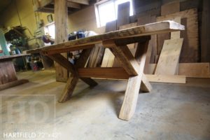Description: 72″ Etobicoke Reclaimed Wood Table – X Style Base – 4″x4″ Windbrace Beam Construction Base -Â 42″ wide – Reclaimed Wood Hemlock Threshing Floor Construction – Premium epoxy/satin polyurethane finish – Original edges/distressing maintainedÂ