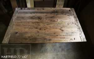 Description: 72″ Etobicoke Reclaimed Wood Table – X Style Base – 4″x4″ Windbrace Beam Construction Base -Â 42″ wide – Reclaimed Wood Hemlock Threshing Floor Construction – Premium epoxy/satin polyurethane finish – Original edges/distressing maintainedÂ