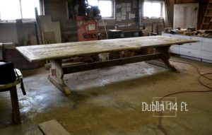 14 Foot Ontario Barnwood Boardroom Table – 56″ wide – Trestle style Base – Reclaimed Pine Threshing Floor – Premium exterior grade epoxy/satin polyurethane finish – Violin shaped base – Posted by Gerald Reinink, Design& Sales