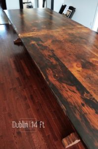 14 Foot Ontario Barnwood Boardroom Table – 56″ wide – Trestle style Base – Reclaimed Pine Threshing Floor – Premium exterior grade epoxy/satin polyurethane finish – Violin shaped base – Posted by Gerald Reinink, Design& Sales
