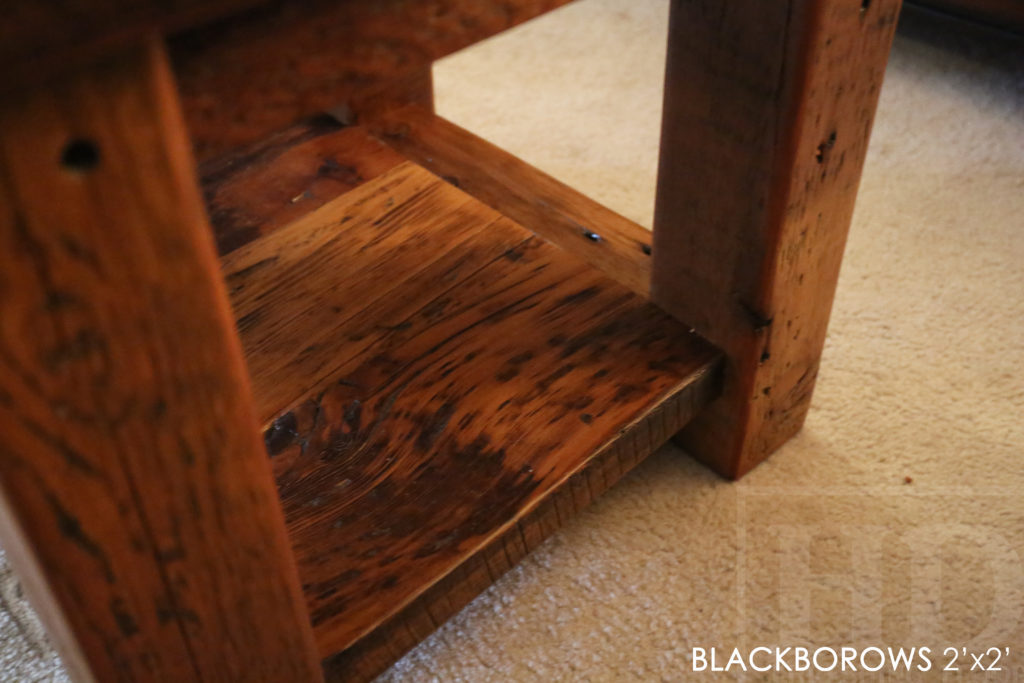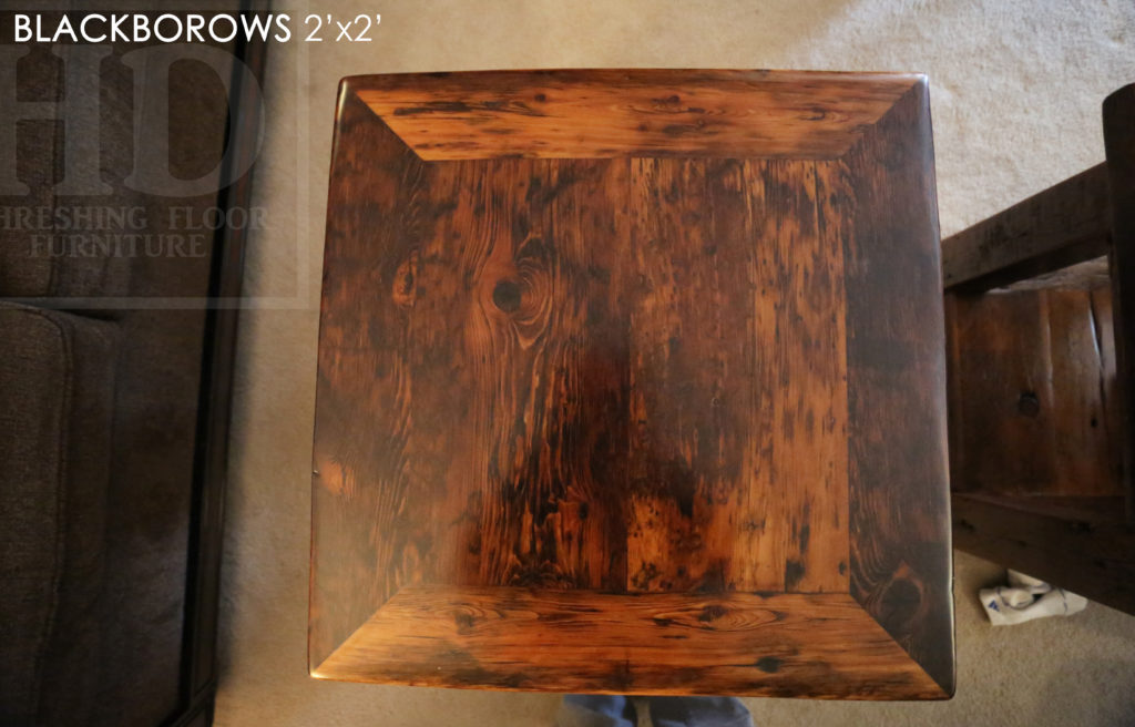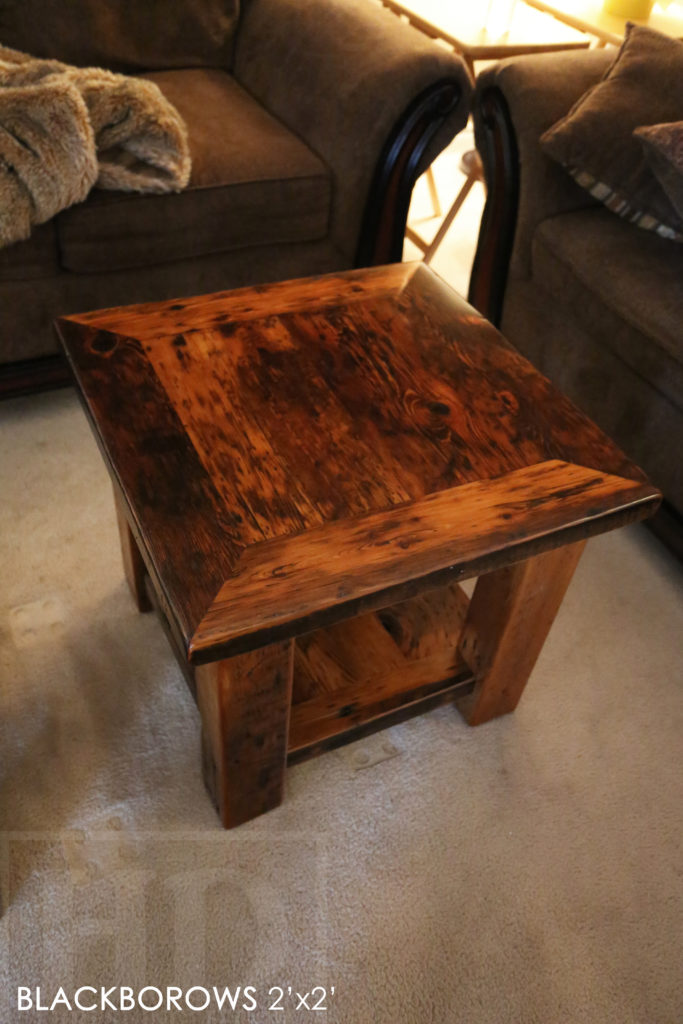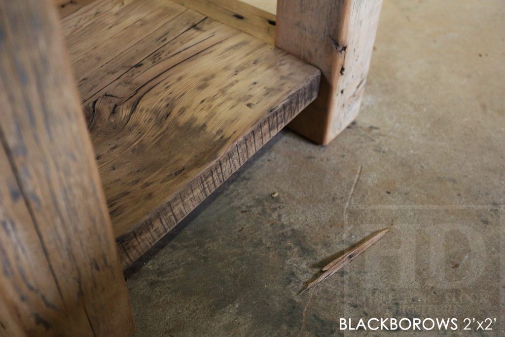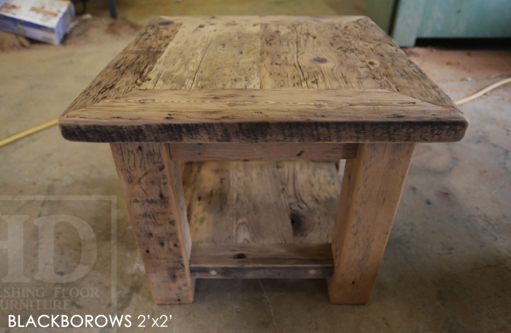 Details: 2′ x 2′ Reclaimed Wood End Tables – 21″ height – Hemlock Threshing Floor Top – Bottom 2″ Grainery Board Shelf – Straight Windbrace Beam Legs – Premium epoxy/satin polyurethane finish – Authentic edges/distressing maintained – Mitered Corners / Copyright HD Threshing Floor Furniture / www.hdthreshing.dreamhosters.com/blog