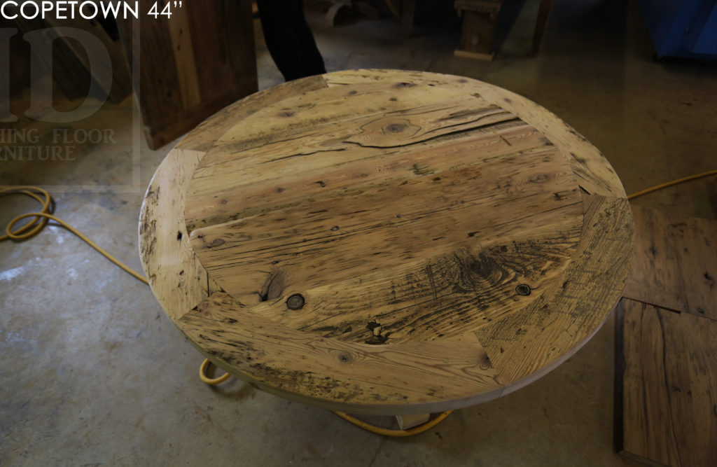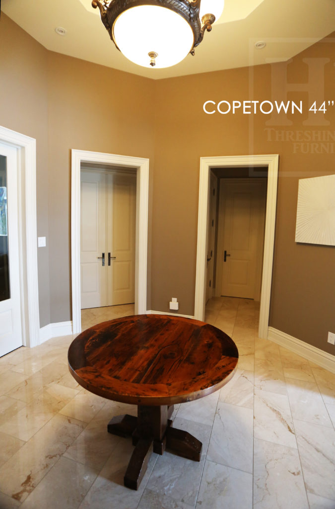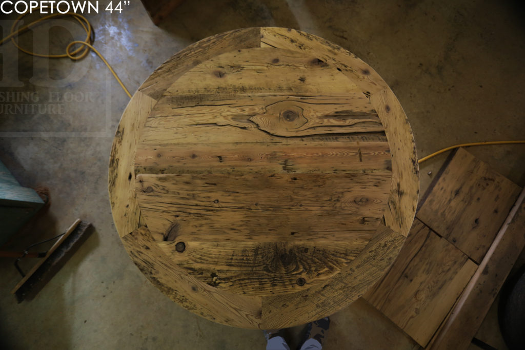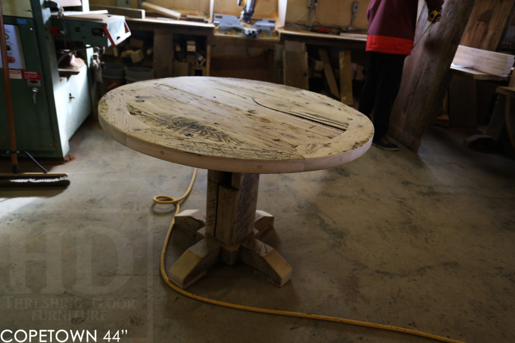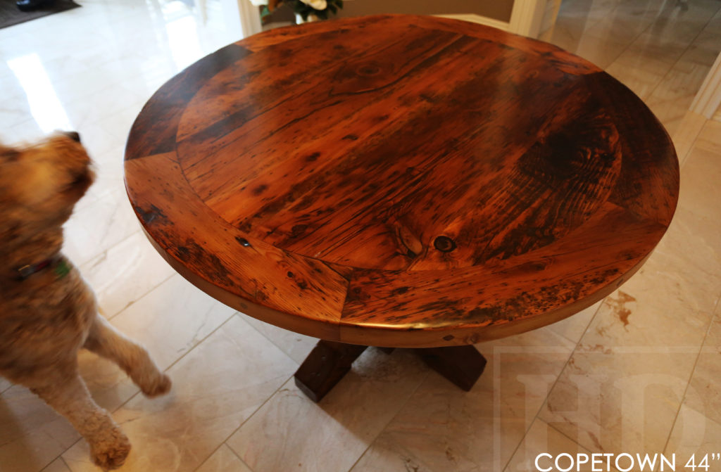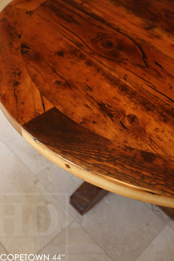 Description: 44″ Round Reclaimed Wood Table for Ancaster, Ontario Home – Reclaimed Pedestal Beam Post Base – Hemlock Threshing Barn Floor Board 2″ Top – Premium epoxy + satin polyurethane finish – Windbrace Beam Feet – Original distressing/edges maintained – Circular bread-edging / Copyright HD Threshing Floor Furniture / www.hdthreshing.dreamhosters.com/blog