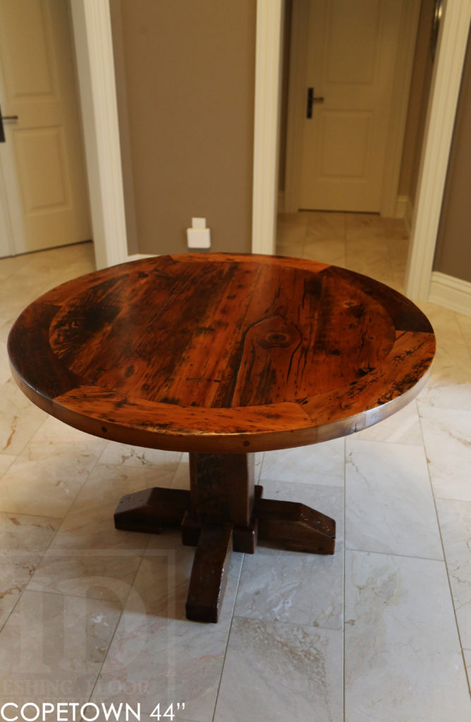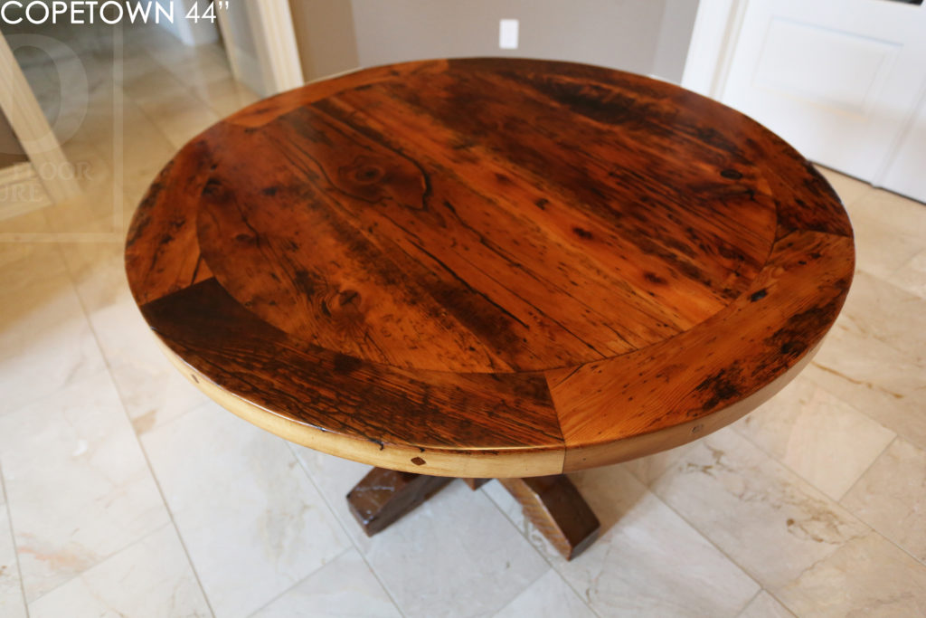 44″ Round Reclaimed Wood Kitchen Table with Epoxy Finish & Pedestal Base for Ancaster, Ontario Home