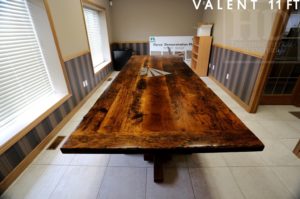 Details: 11 ft Guelph, Ontario Boardroom Table – Double Hand-Hewn Beam Posts Base – 48″ wide – Reclaimed Barnwood Hemlock 2″ Solid Wood Top – Custom Steel Logo Embedded in Table Top – Premium epoxy base coat + Satin Polyurethane Topcoat – Original barn floor board live edges – Poster Gerald Reinink, Design/Sales