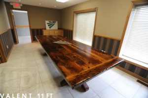Details: 11 ft Guelph, Ontario Boardroom Table – Double Hand-Hewn Beam Posts Base – 48″ wide – Reclaimed Barnwood Hemlock 2″ Solid Wood Top – Custom Steel Logo Embedded in Table Top – Premium epoxy base coat + Satin Polyurethane Topcoat – Original barn floor board live edges – Poster Gerald Reinink, Design/Sales