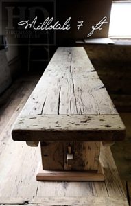 Details: 84″ Trestle Table – 42″ inches wide – Premium epoxy resin + polyurethane clearcoat finish – Reclaimed Hemlock Threshing Floor Construction – 7 ft [matching] trestle style bench – 2″ original live edge barn floor boards tops – 5 Plank Back Wormy Maple Chairs