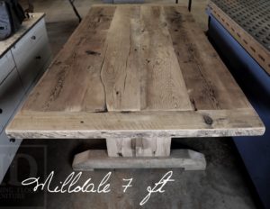 Details: 84″ Trestle Table – 42″ inches wide – Premium epoxy resin + polyurethane clearcoat finish – Reclaimed Hemlock Threshing Floor Construction – 7 ft [matching] trestle style bench – 2″ original live edge barn floor boards tops – 5 Plank Back Wormy Maple Chairs
