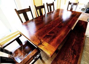 Details: 84″ Trestle Table – 42″ inches wide – Premium epoxy resin + polyurethane clearcoat finish – Reclaimed Hemlock Threshing Floor Construction – 7 ft [matching] trestle style bench – 2″ original live edge barn floor boards tops – 5 Plank Back Wormy Maple Chairs