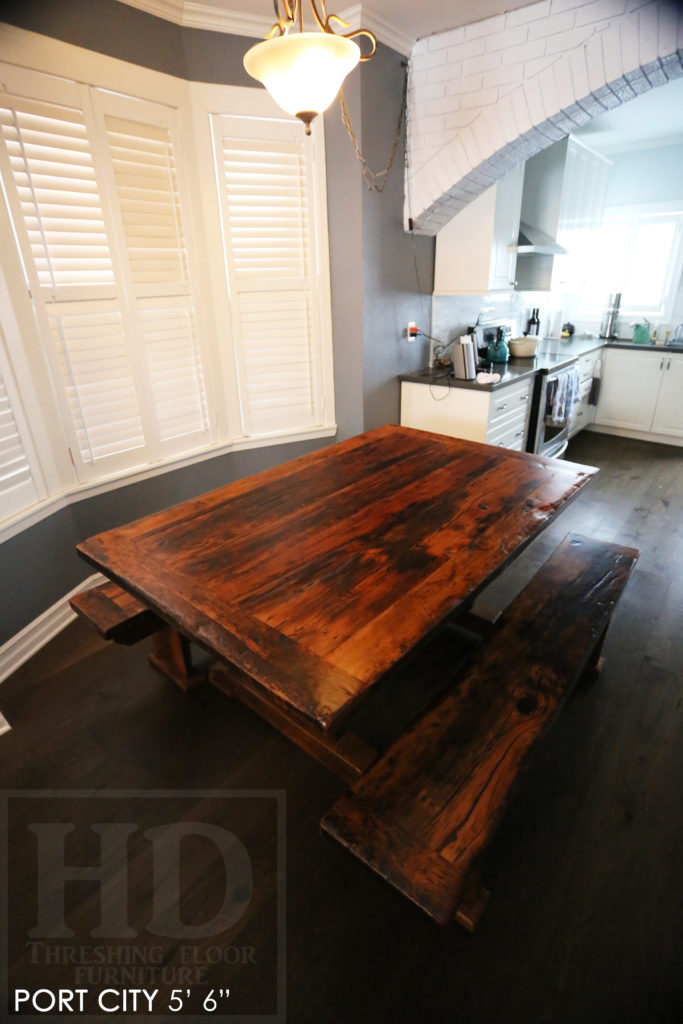 Description: 5′ 6″ Reclaimed Wood Table for Hamilton Home – 42″ wide – Trestle Base – Hemlock Threshing Floor Construction / Medium Sanding out of Old Patina – Rustic Original Distressing & Edges Maintained – [Light coating] Epoxy + Polyurethane Finish – [Two] Matching 5’6″ Reclaimed Wood Benches / Copyright HD Threshing Floor Furniture / www.hdthreshing.dreamhosters.com/blog