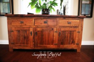 Details: 6 foot Custom Dining Console – 18″ deep – 3 drawers – 3 doors – Lee Valley Antique Copper Hardware – Premium epoxy/polyurethane finish – Reclaimed Hemlock Construction – Original Barnwood Edges