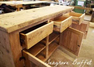 Details: 6 foot Custom Dining Console – 18″ deep – 3 drawers – 3 doors – Lee Valley Antique Copper Hardware – Premium epoxy/polyurethane finish – Reclaimed Hemlock Construction – Original Barnwood Edges