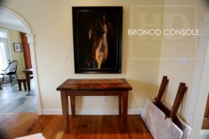 Description: 48″ Reclaimed Wood Console Sideboard Table – 24″ deep – Tapered Windbrace Beam Legs – 34″ height [to accommodate painting] – Reclaimed Hemlock 2″ Threshing Floor Top – 1″ Grainery Board Skirting – Original barn floor live edges
