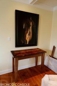 Description: 48″ Reclaimed Wood Console Sideboard Table – 24″ deep – Tapered Windbrace Beam Legs – 34″ height [to accommodate painting] – Reclaimed Hemlock 2″ Threshing Floor Top – 1″ Grainery Board Skirting – Original barn floor live edges