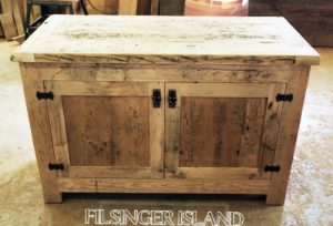 Description: Reclaimed Wood Island – Reclaimed Pine Construction – Premium epoxy/polyurethane finish – 2 doors / Internal Grainery Board Shelving – Lee Valley Hardware – Original barnwood live edges