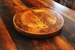 Description: 84″ Reclaimed Wood Table – Frame Style Base – 42″ wide – Premium epoxy – Matte Polyurethane Topcoat – Reclaimed Hemlock Threshing Floor Construction – 7 ft [matching] Trestle Style Bench – 18″ [matching] Lazy Susan – Original live barnwood edges maintained
