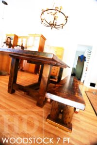 Description: 84″ Reclaimed Wood Table – Frame Style Base – 42″ wide – Premium epoxy – Matte Polyurethane Topcoat – Reclaimed Hemlock Threshing Floor Construction – 7 ft [matching] Trestle Style Bench – 18″ [matching] Lazy Susan – Original live barnwood edges maintained