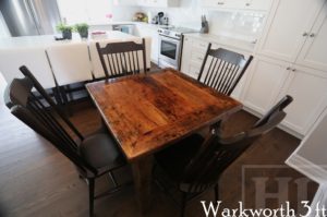 Description: 36 Inch x 36 Inch Rustic Harvest Table – Tapered Windbrace Beam Legs – Mitred Corners – Premium epoxy & polyurethane finish – Reclaimed Hemlock Threshing Floor 2″ Live Barnwood Edge Top – 1″ Grainery Board Skirting
