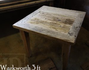 Description: 36 Inch x 36 Inch Rustic Harvest Table – Tapered Windbrace Beam Legs – Mitred Corners – Premium epoxy & polyurethane finish – Reclaimed Hemlock Threshing Floor 2″ Live Barnwood Edge Top – 1″ Grainery Board Skirting