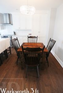 Description: 36 Inch x 36 Inch Rustic Harvest Table – Tapered Windbrace Beam Legs – Mitred Corners – Premium epoxy & polyurethane finish – Reclaimed Hemlock Threshing Floor 2″ Live Barnwood Edge Top – 1″ Grainery Board Skirting