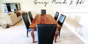 Description: 7 ft Georgian Bluffs Harvest Table – 42″ wide – Reclaimed Hemlock Threshing Floor Construction – Barn frame windbrace beam cabriole legs – Premium epoxy/polyurethane finish – Original barnwood edges maintained – 6 Black Topgrain Leather Parsons Chairs