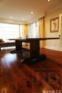 Details: 7.5 ft Reclaimed Wood Table – Trestle Style Base – 42″ wide- Reclaimed Hemlock Threshing Floor Construction – Premium epoxy/polyurethane finish – Original barnwood edges maintained