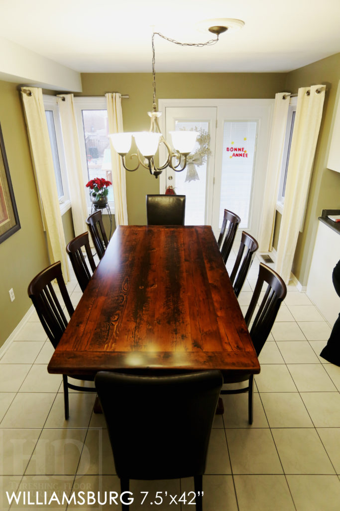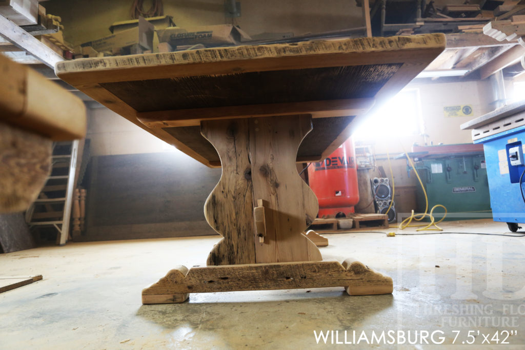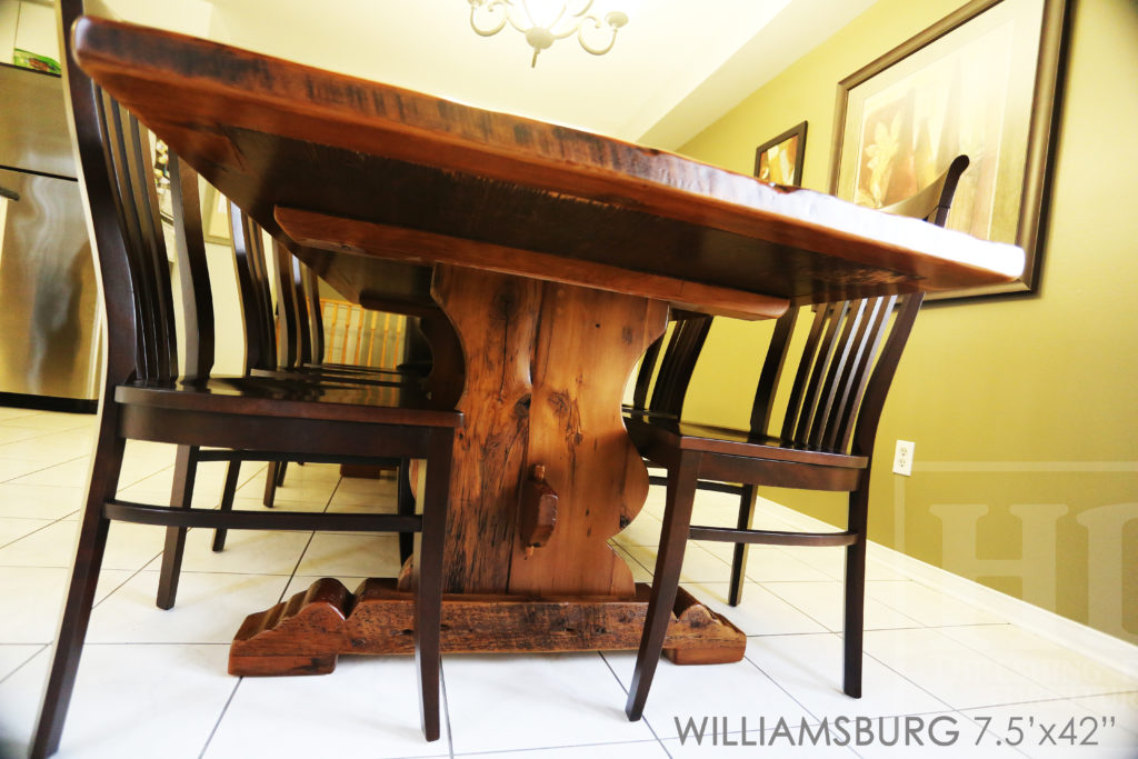 Specs: 7.5 ft Whitby, Ontario Trestle Table – 3.5′ wide – Violin Shaped Base Profile – Solid Reclaimed Hemlock Threshing Floor Construction – Original edge/distressing maintained – 6 Athena Chairs / Wormy Maple – Black Frame / Seat Stained Dominant Tone of Table Top / Polyurethane Clearcoat Finish / Copyright HD Threshing Floor Furniture / www.hdthreshing.dreamhosters.com/blog