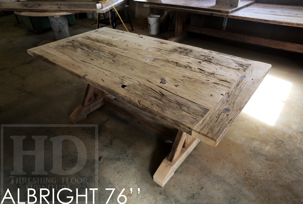 76″ Sawbuck Table – 38″ wide – Reclaimed Hemlock Threshing Floor Construction – Premium [lighter coating] epoxy/polyurethane finish – Original barnwood edges maintained