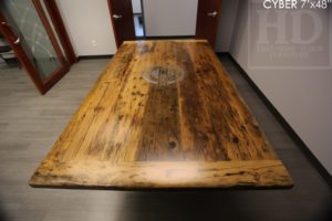 Description: 7 ft Reclaimed Wood Table – 48″ wide – Reclaimed Hemlock Threshing Floor Construction – Premium epoxy/polyurethane finish – Greytone treatment to Preserve Colour of Unfinished – Custom laser cut steel logo embedded in table top – 3″ thick extra thick top – Original distressing/edges maintainedÂÂ