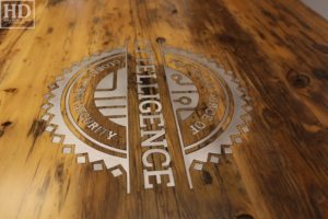 Description: 7 ft Reclaimed Wood Table – 48″ wide – Reclaimed Hemlock Threshing Floor Construction – Premium epoxy/polyurethane finish – Greytone treatment to Preserve Colour of Unfinished – Custom laser cut steel logo embedded in table top – 3″ thick extra thick top – Original distressing/edges maintainedÂÂ