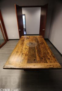 Description: 7 ft Reclaimed Wood Table – 48″ wide – Reclaimed Hemlock Threshing Floor Construction – Premium epoxy/polyurethane finish – Greytone treatment to Preserve Colour of Unfinished – Custom laser cut steel logo embedded in table top – 3″ thick extra thick top – Original distressing/edges maintainedÂÂ