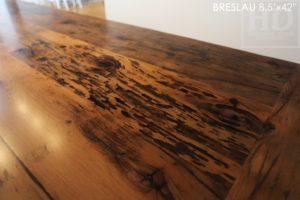 Description: 8.5 ft Reclaimed Wood Table – 42″ wide – Reclaimed Hemlock Threshing Floor Barnwood Construction – Premium epoxy with satin polyurethane finish – Original edges/distressing keptÂ