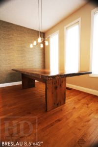 Description: 8.5 ft Reclaimed Wood Table – 42″ wide – Reclaimed Hemlock Threshing Floor Barnwood Construction – Premium epoxy with satin polyurethane finish – Original edges/distressing keptÂ