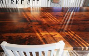 Specifications: 8 ft Harvest Table – 40″ wide – Premium epoxy resin + polyurethane finish – Reclaimed Pine Threshing Floor 2″ Top – Tapered with a Notch Windbrace Beam Legs – Custom White Skirting and Legs – Original Live Barnwood Edges