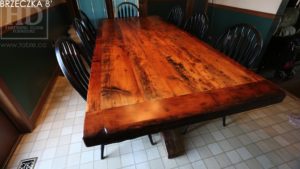 Description: 8′ Reclaimed Wood Winery Pedestal Table – 42″ wide- Hand-Hewn Pedestals Base – Hemlock Threshing Floor Construction – Original distressing/edges kept – 3″ extra thick top – Premium epoxy/satin polyurethane finish – 6 Bent Arrow Chairs – Wormy Maple / Black / Polyurethane clearcoat finish