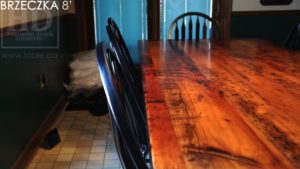 Description: 8′ Reclaimed Wood Winery Pedestal Table – 42″ wide- Hand-Hewn Pedestals Base – Hemlock Threshing Floor Construction – Original distressing/edges kept – 3″ extra thick top – Premium epoxy/satin polyurethane finish – 6 Bent Arrow Chairs – Wormy Maple / Black / Polyurethane clearcoat finish