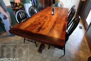 Description: 8′ Reclaimed Wood Winery Pedestal Table – 42″ wide- Hand-Hewn Pedestals Base – Hemlock Threshing Floor Construction – Original distressing/edges kept – 3″ extra thick top – Premium epoxy/satin polyurethane finish – 6 Bent Arrow Chairs – Wormy Maple / Black / Polyurethane clearcoat finish