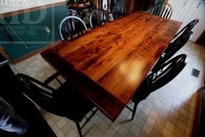 Description: 8′ Reclaimed Wood Winery Pedestal Table – 42″ wide- Hand-Hewn Pedestals Base – Hemlock Threshing Floor Construction – Original distressing/edges kept – 3″ extra thick top – Premium epoxy/satin polyurethane finish – 6 Bent Arrow Chairs – Wormy Maple / Black / Polyurethane clearcoat finish