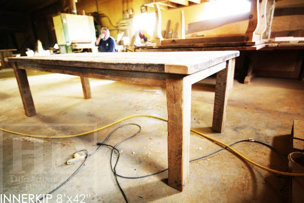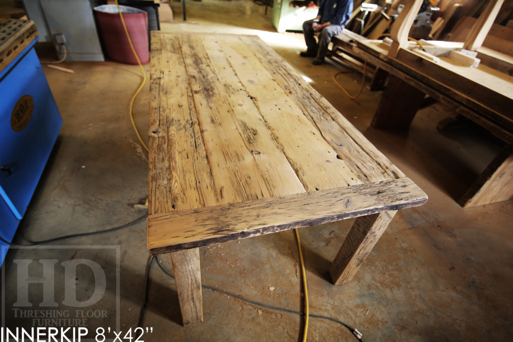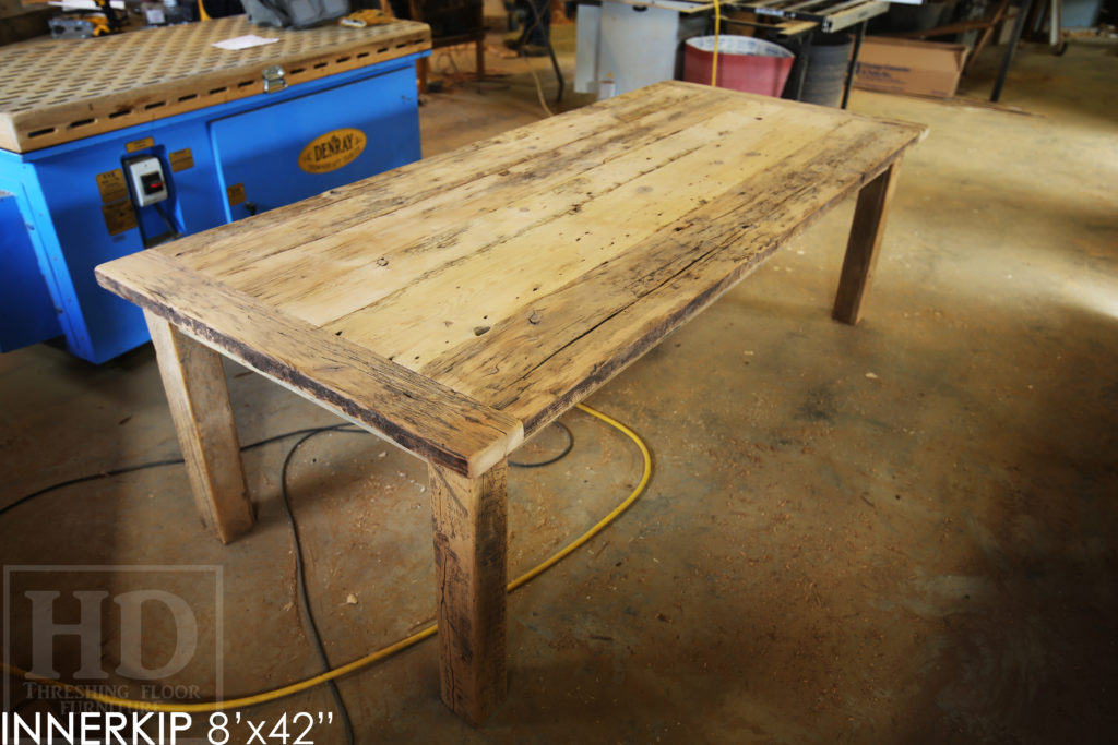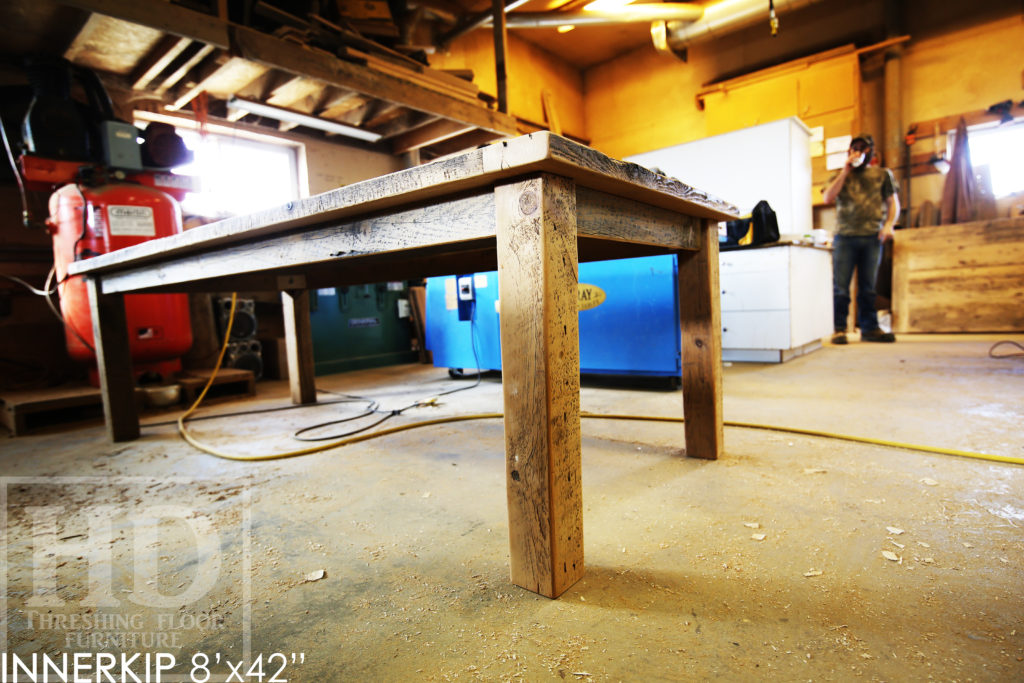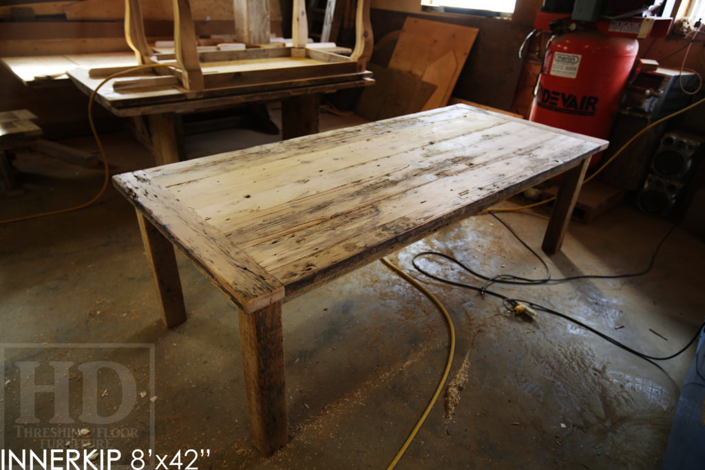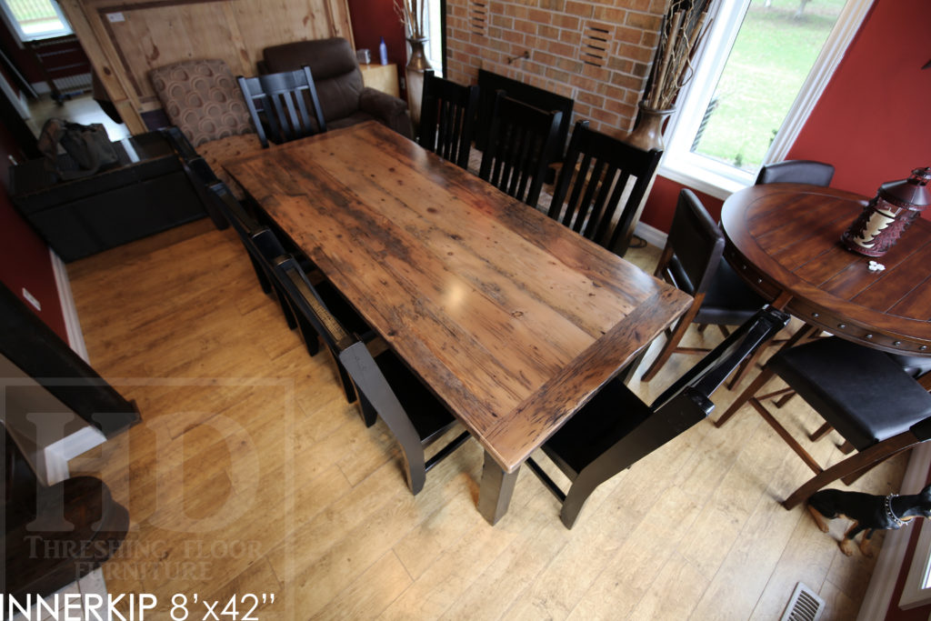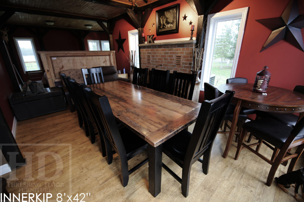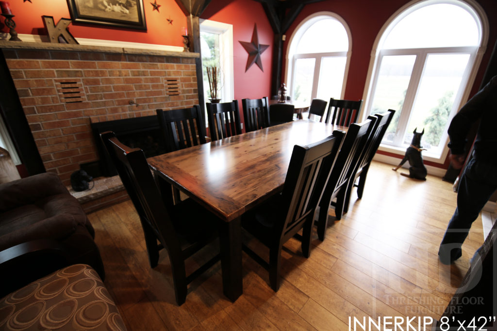 Specifications: Rustic 8′ Harvest Table – 42″ wide – Reclaimed Hemlock Threshing Floor Construction – Straight 4″x4″ Windbrace Beam Legs / Painted Skirting & Legs – Premium epoxy + matte polyurethane finish – Greytone Treatment to Maintain Colour of Unfinished – 6 Strongback Chairs / Wormy Maple / Painted Solid Black / Polyurethane Clearcoat Finish / Copyright HD Threshing Floor Furniture / www.hdthreshing.dreamhosters.com/blog