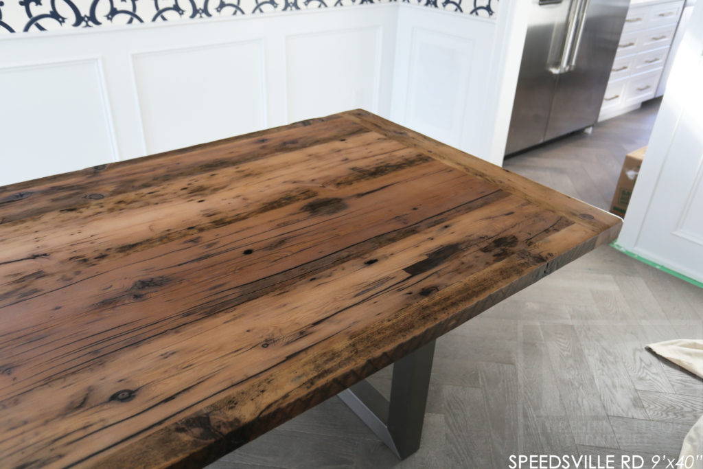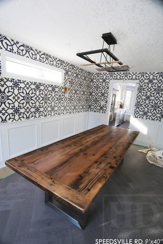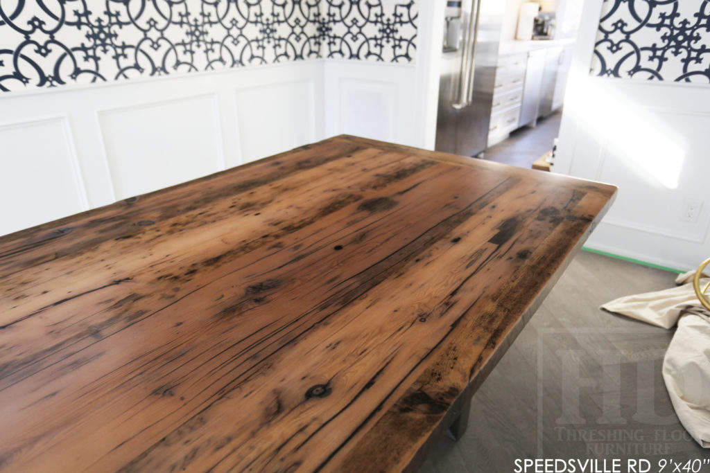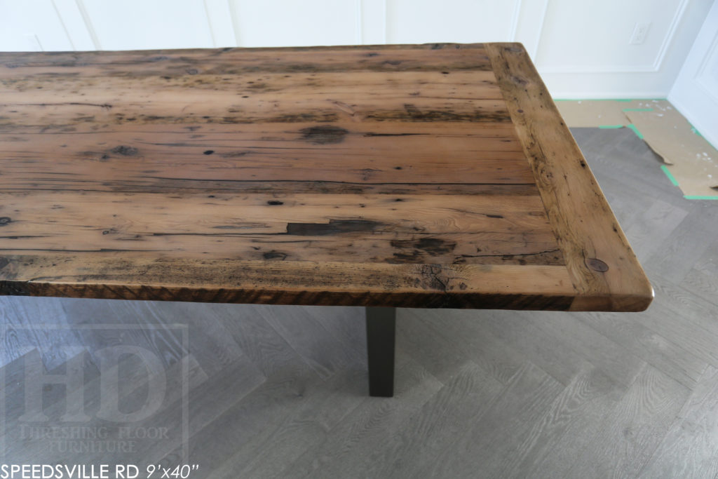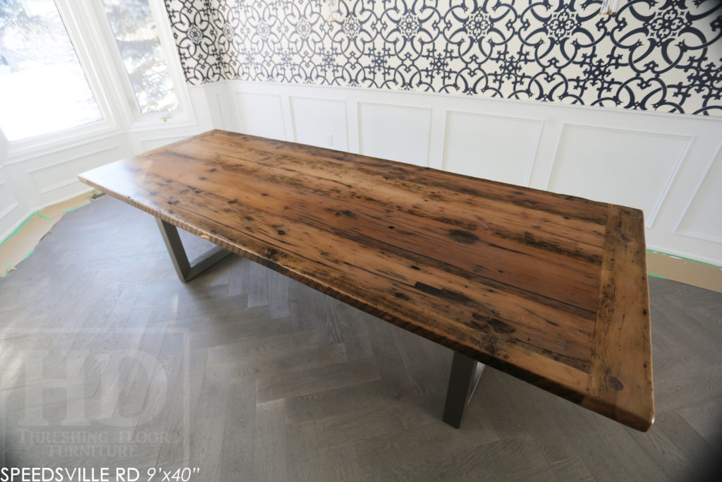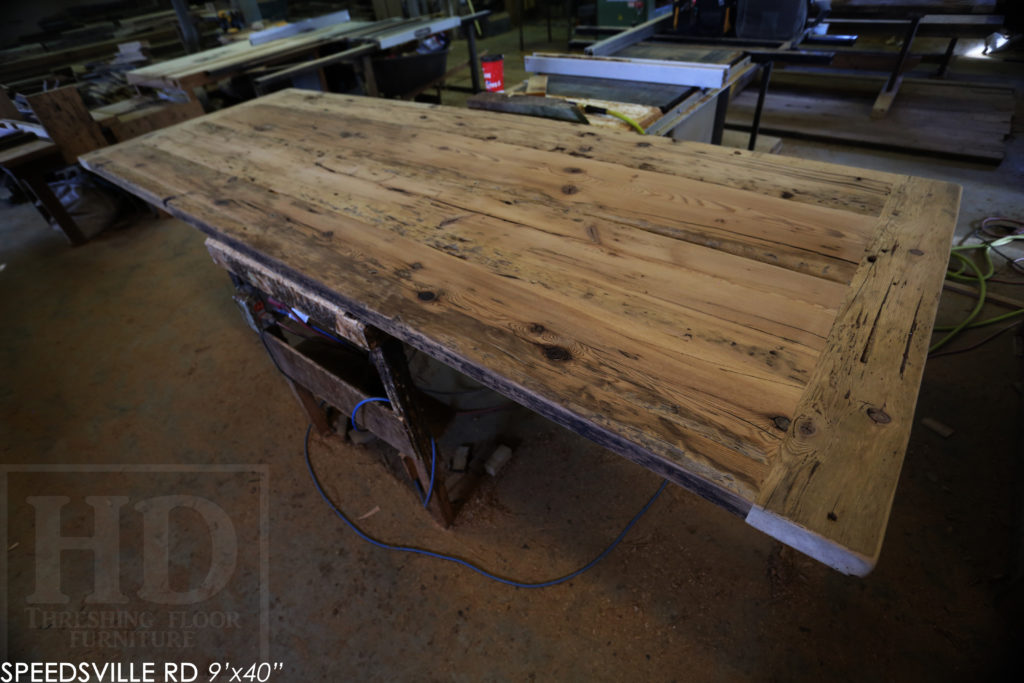 Details: 9′ Reclaimed Wood Boardroom Table for Cambridge Company – 40″ wide – Hemlock Threshing Floor Construction – Original barnwood edges/distressing maintained – Greytone Treatment [to maintain colour of unfinished] – Premium epoxy/matte polyurethane finish – www.hdthreshing.dreamhosters.com/blog