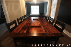 Details of Table: 9 ft Double Hand-Hewn Beam Pedestal Table – 57″ wide – Premium epoxy/matte polyurethane finish – Reclaimed Hemlock Threshing Floor 2″ top – Two 15″ x 24″ Trays