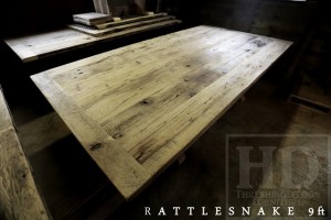 Details of Table: 9 ft Double Hand-Hewn Beam Pedestal Table – 57″ wide – Premium epoxy/matte polyurethane finish – Reclaimed Hemlock Threshing Floor 2″ top – Two 15″ x 24″ Trays