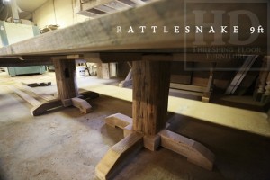Details of Table: 9 ft Double Hand-Hewn Beam Pedestal Table – 57″ wide – Premium epoxy/matte polyurethane finish – Reclaimed Hemlock Threshing Floor 2″ top – Two 15″ x 24″ Trays