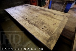 Details of Table: 9 ft Double Hand-Hewn Beam Pedestal Table – 57″ wide – Premium epoxy/matte polyurethane finish – Reclaimed Hemlock Threshing Floor 2″ top – Two 15″ x 24″ Trays
