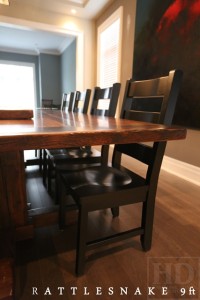 Details of Table: 9 ft Double Hand-Hewn Beam Pedestal Table – 57″ wide – Premium epoxy/matte polyurethane finish – Reclaimed Hemlock Threshing Floor 2″ top – Two 15″ x 24″ Trays