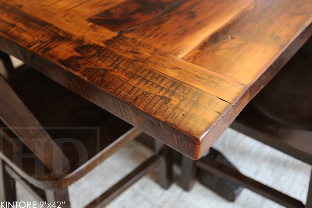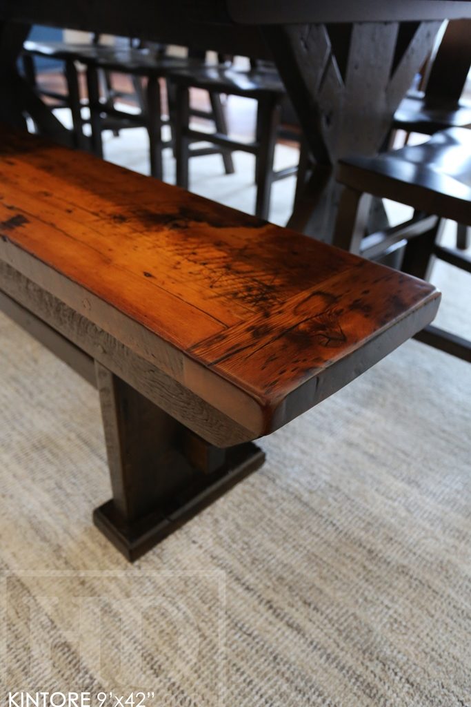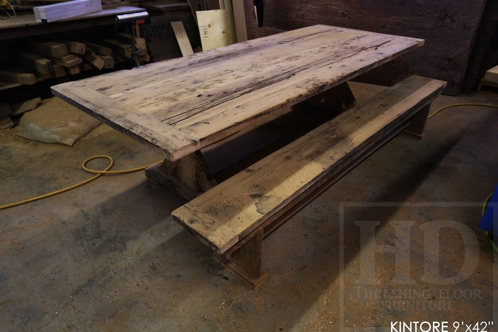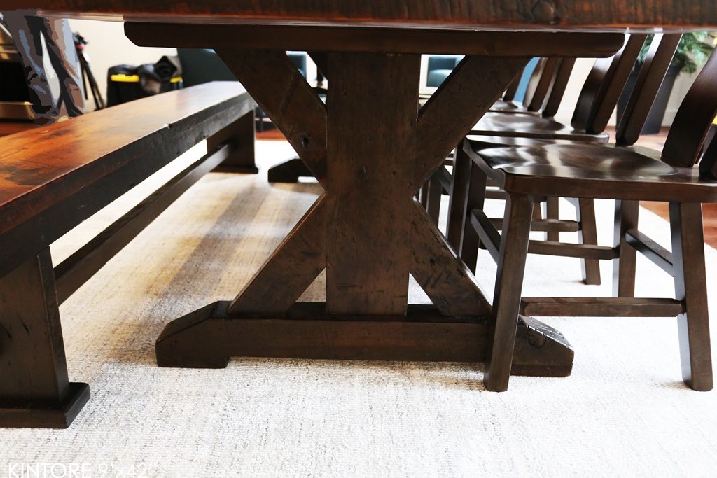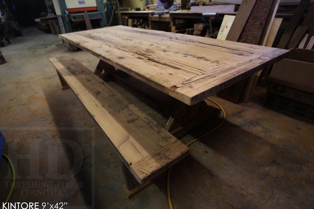 Description: 9 ft Sawbuck Table – 42″ wide – Premium [light coating] epoxy/matte polyurethane finish – Reclaimed Hemlock Threshing Floor Construction – Original edges/distressing maintained – 9 ft [matching] Trestle Style Bench – 6 Plank Back Chairs / Wormy Maple / Black Stain / Polyurethane clearcoat finish – Copyright HD Threshing Floor Furniture / www.hdthreshing.dreamhosters.com/blog
