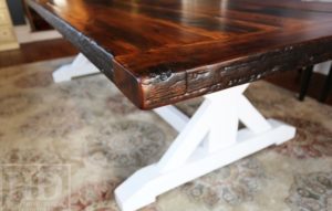Description: 9 ft Reclaimed Wood Table – Sawbuck Style Base – Hemlock Threshing Floor Construction – Original barnwood distressing maintained – Premium [light coating] epoxy/matte polyurethane finish – 3″ extra thick top -Â Solid White Painted Base