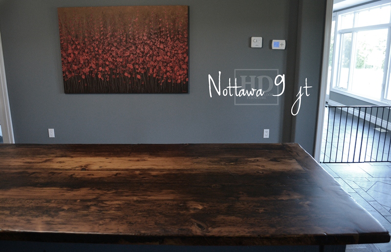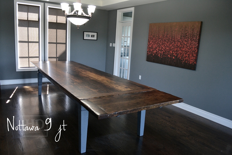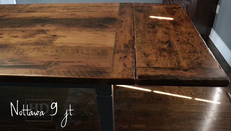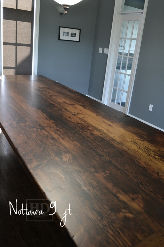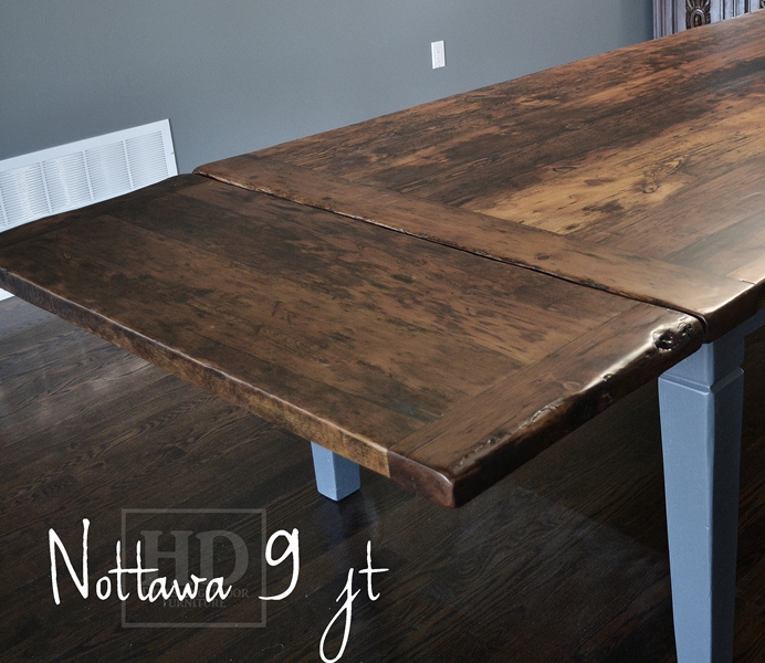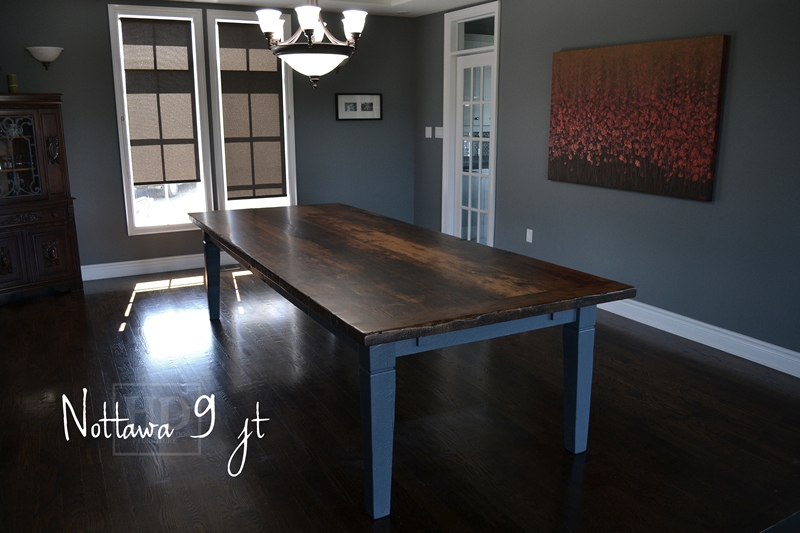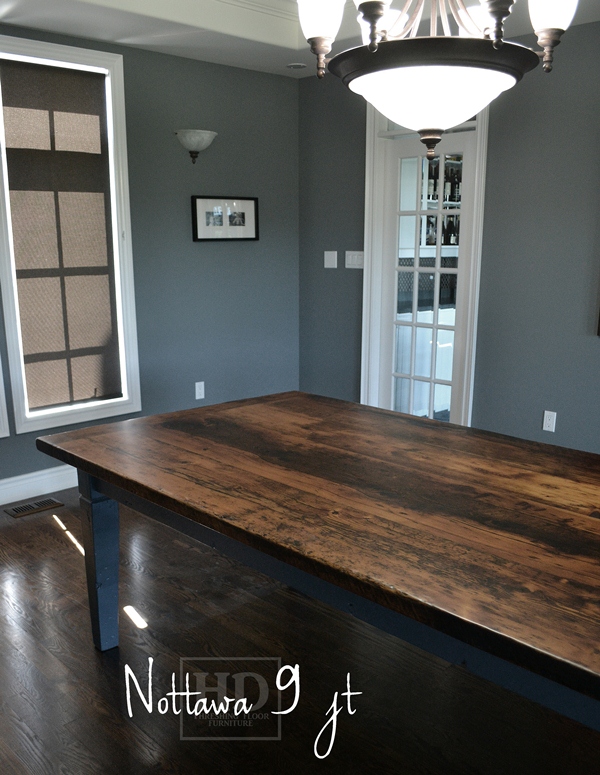 Specifications: 10 foot Harvest Table – 48″ wide – Tapered with a Notch Legs – Reclaimed Hemlock Threshing Floor – Benjamin Moore Gravel Gray Painted Legs and Skirting – Premium epoxy/matte polyurethane finish